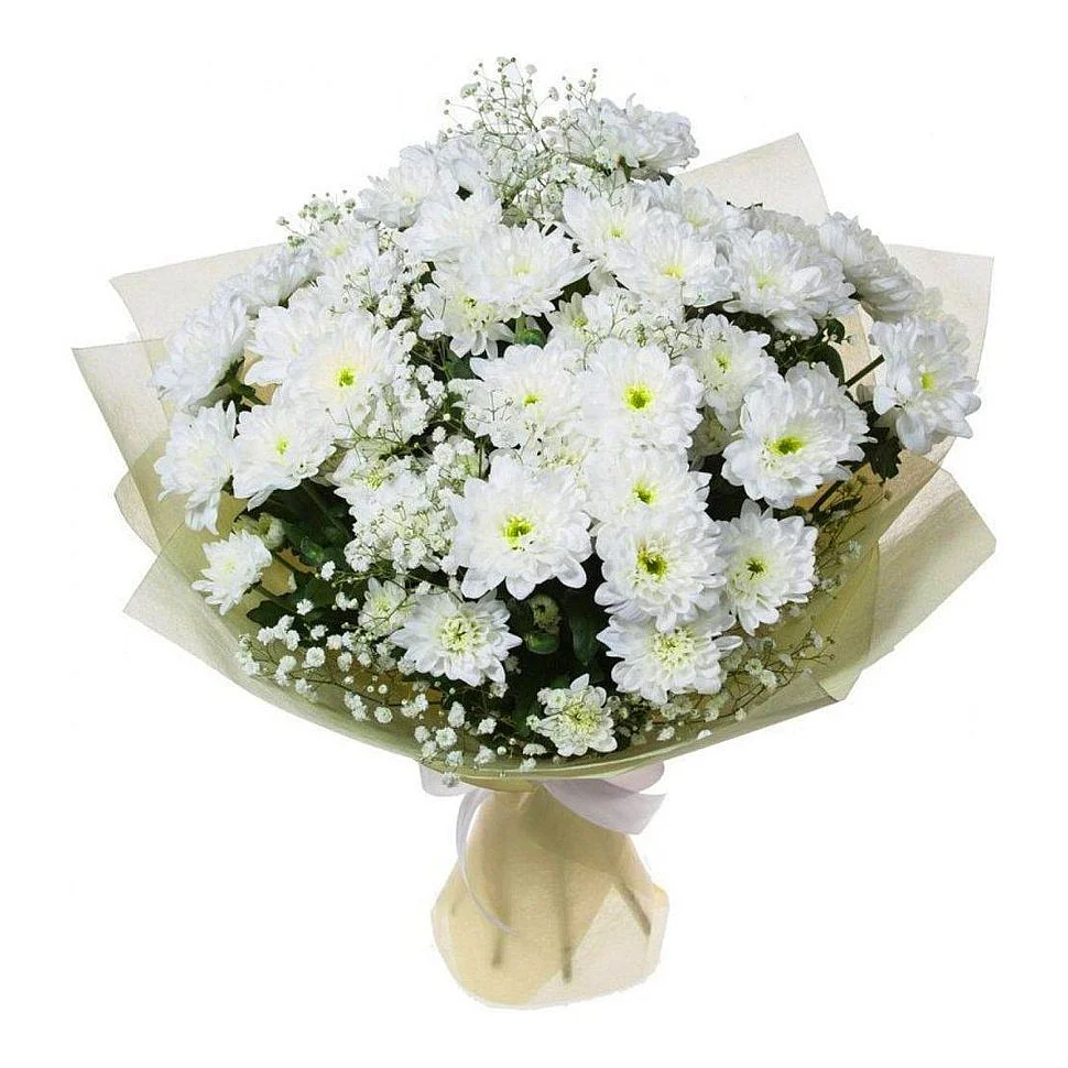 - Стандарт - кустовая хризантема - 5 шт., гипсофила, упаковка, лента