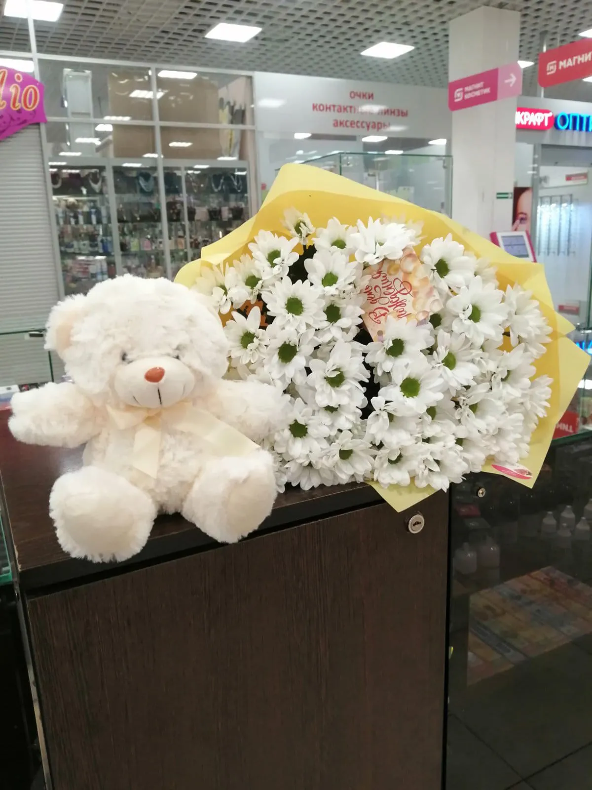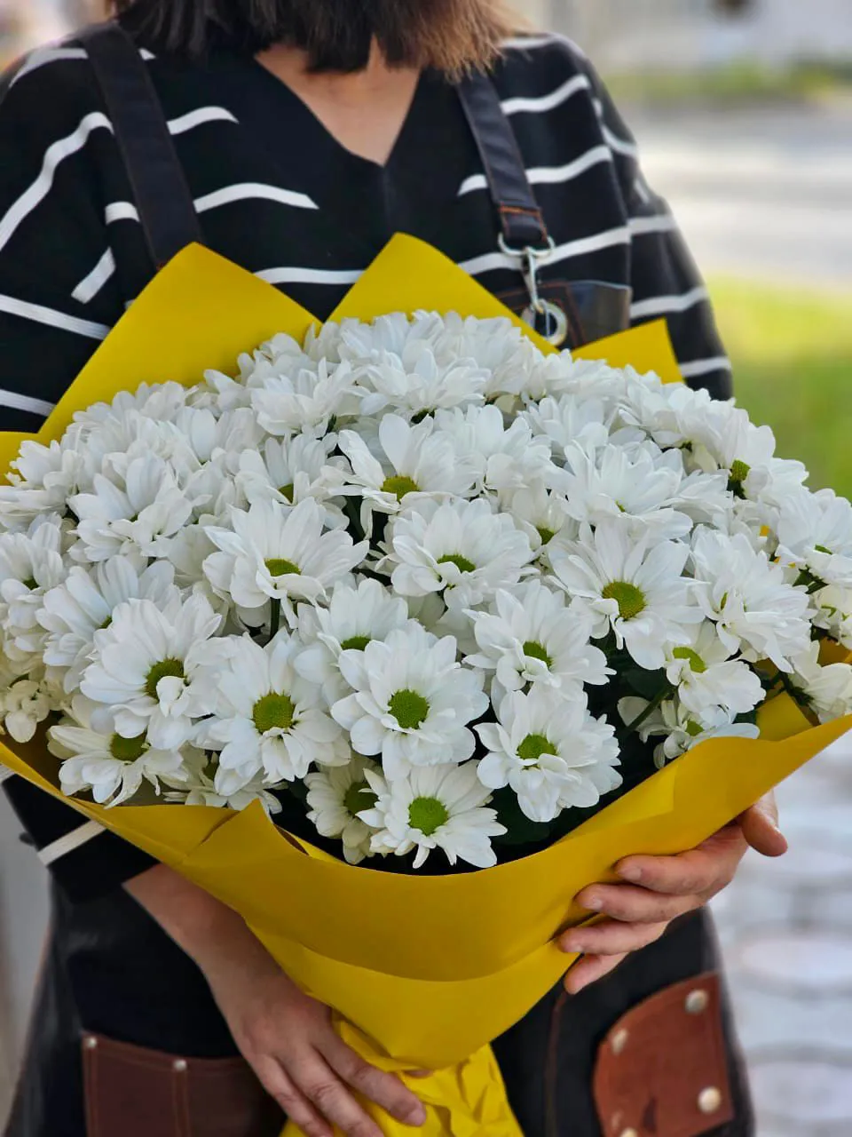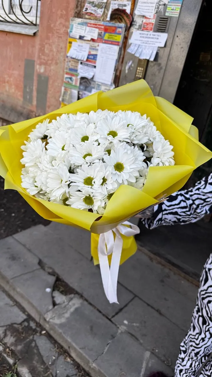 Белые кустовые хризантемы,упаковка,лента |