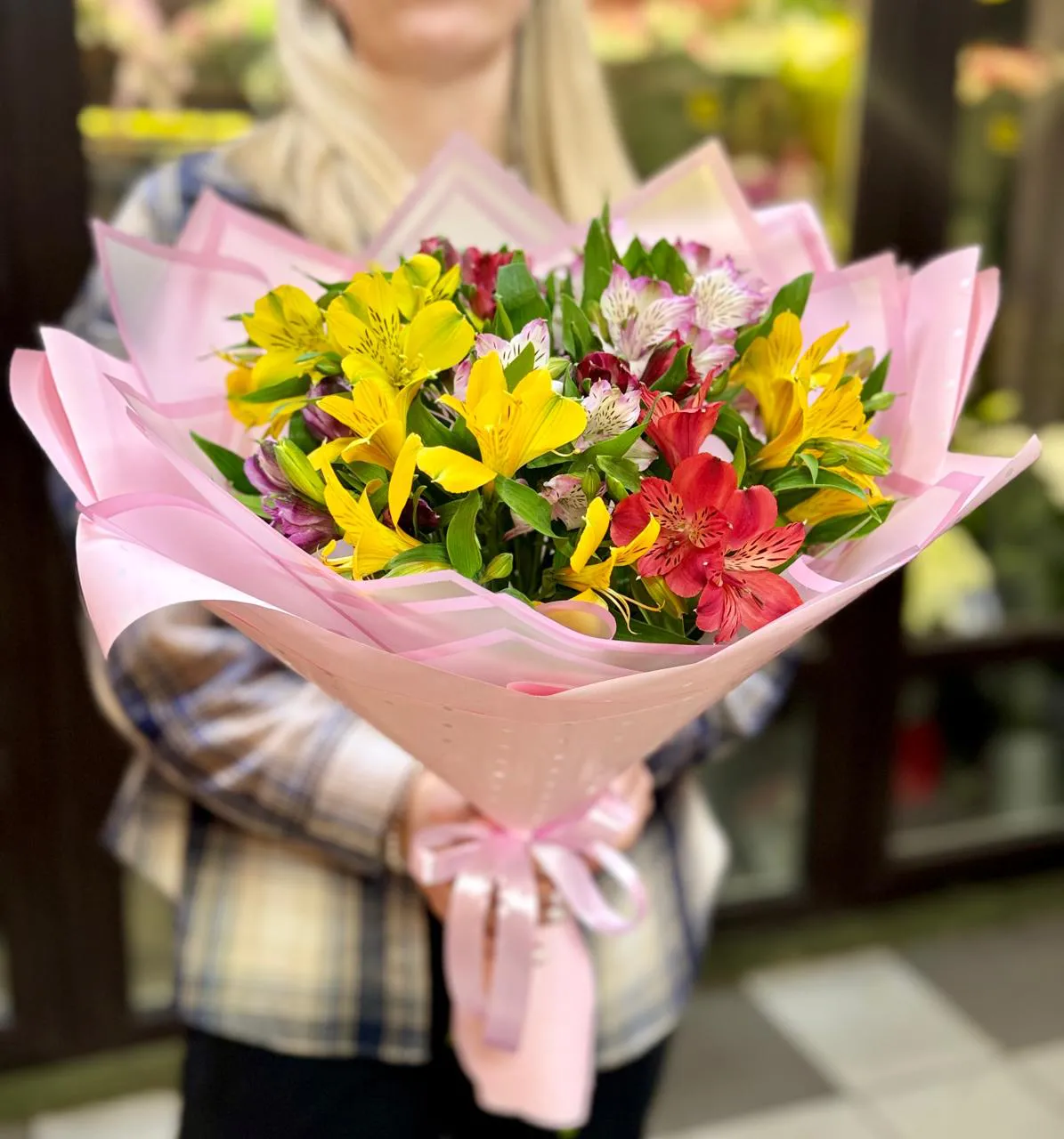 Альстромерия, зелень, упаковка, лента |
