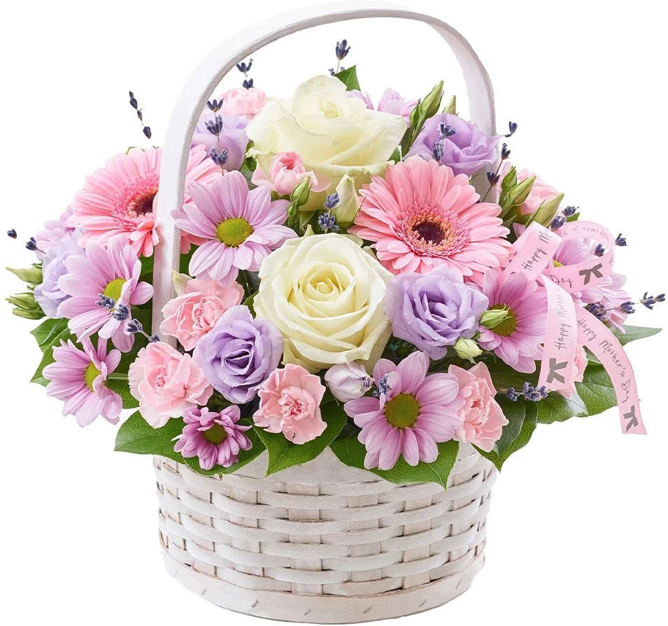роза - 5 шт., гербера - 3 шт., эустома - 3 шт., кустовая хризантема - 5 шт., зелень, оазис, корзина |