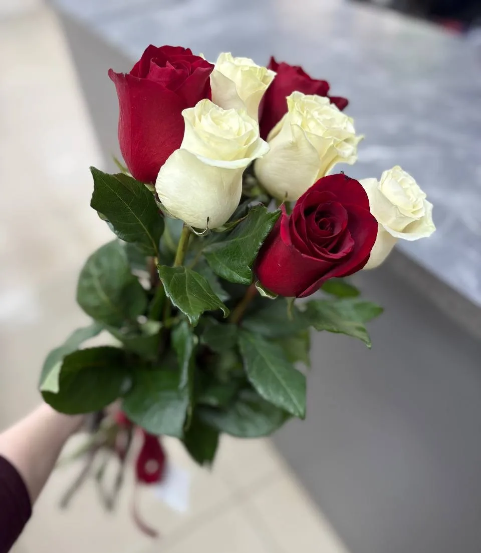 Одноголовые розы - красные и белые,лента |