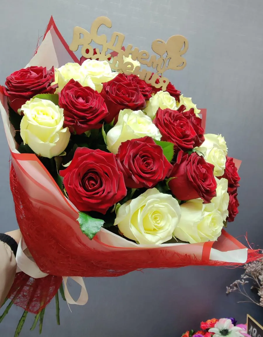 - Делюкс - роза - 25 шт., зелень, топпер, упаковка, лента