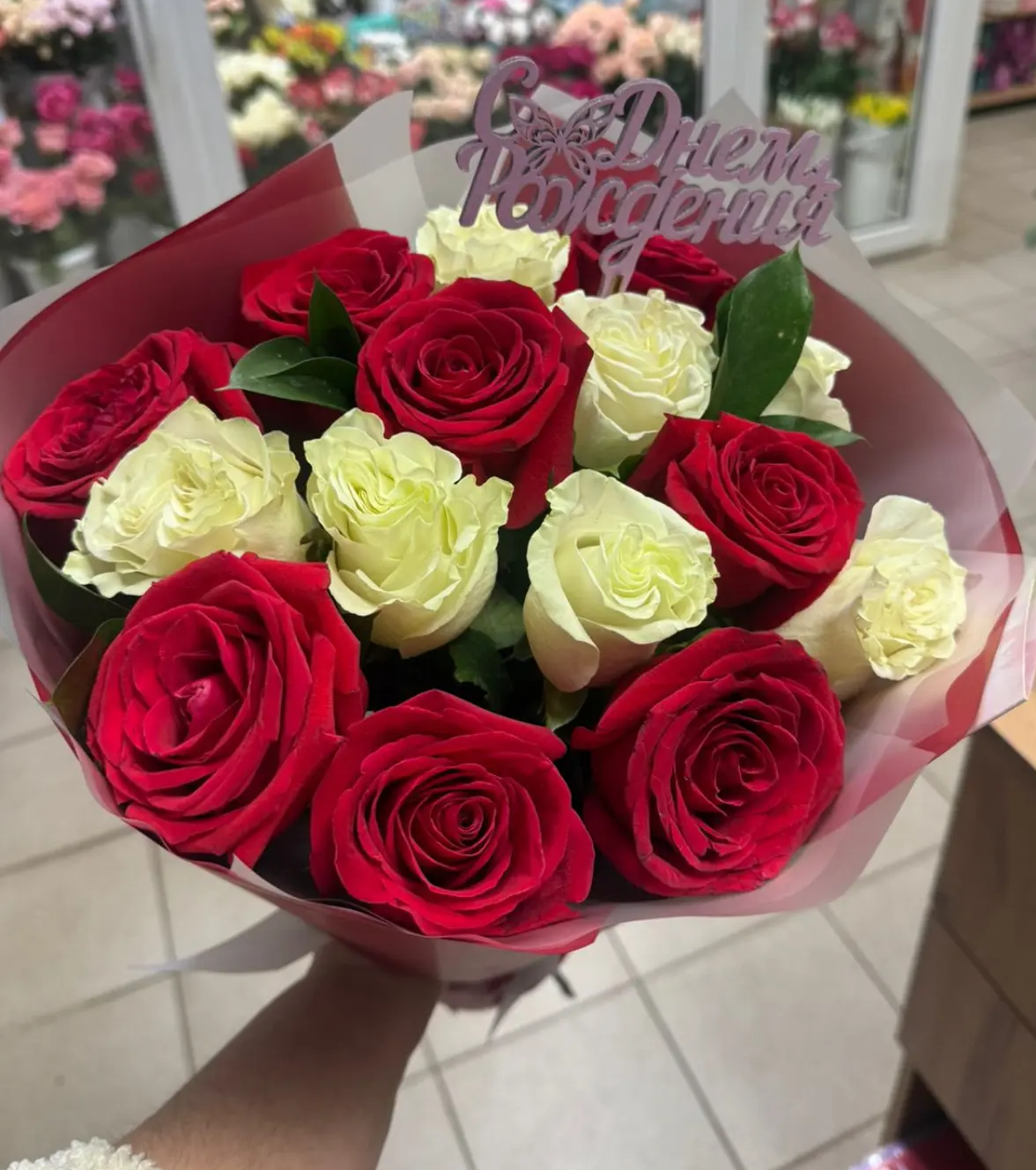- Средний - роза - 9 шт., зелень, топпер, упаковка, лента
