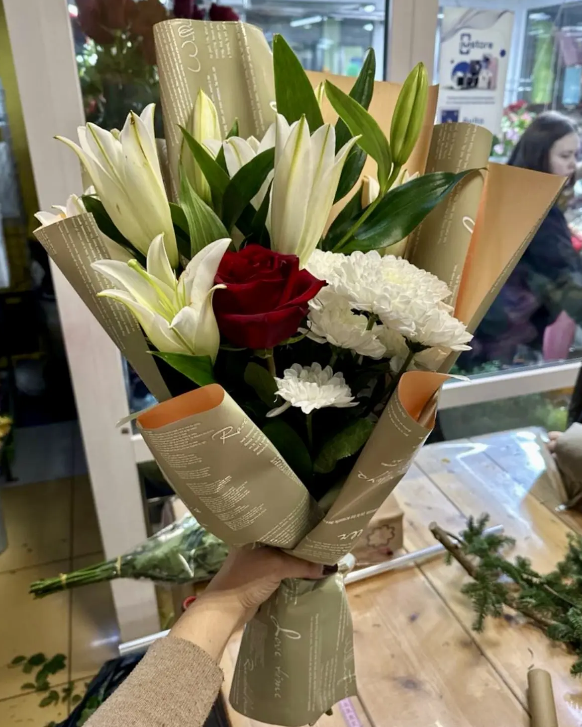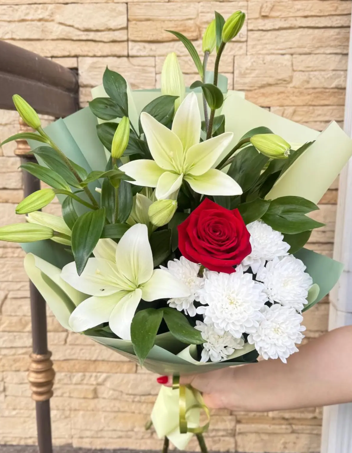 Лилии, роза, кустовая хризантема, упаковка, лента |