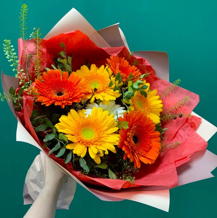 - Средний - гербера 7 шт., упаковка, лента