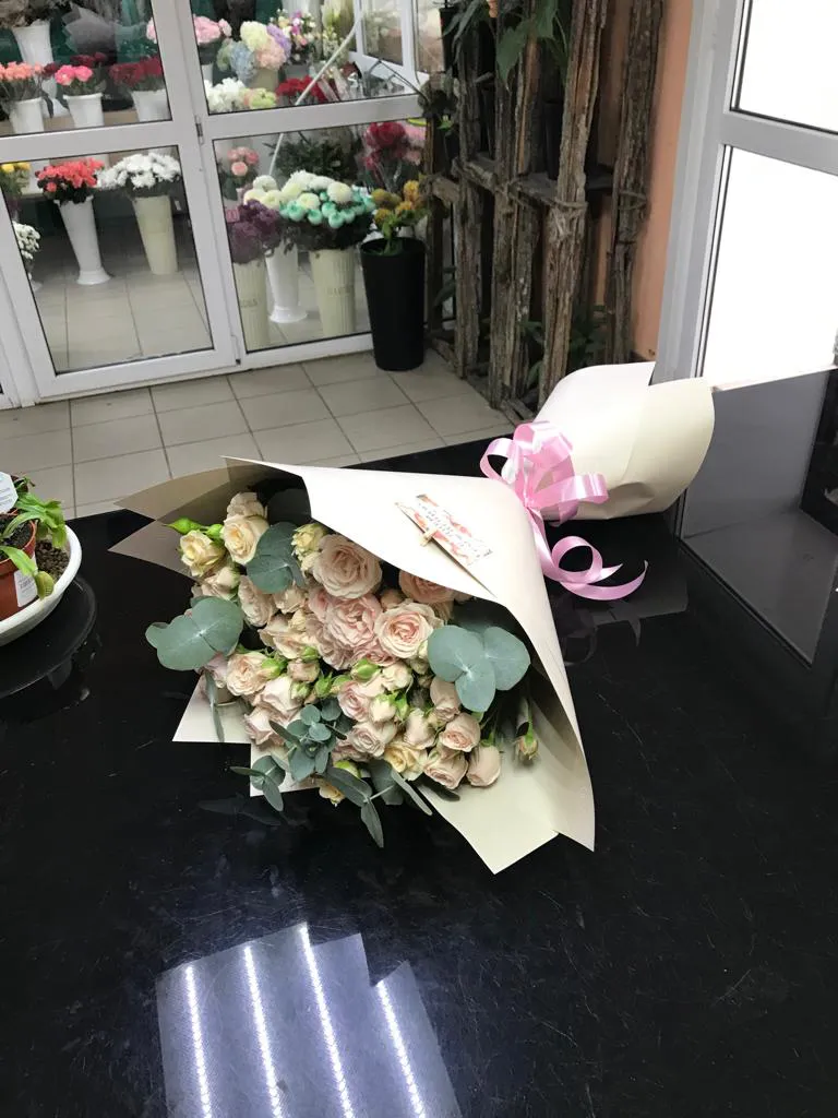 - Средний - кустовая роза - 7 шт., зелень, упаковка, лента
