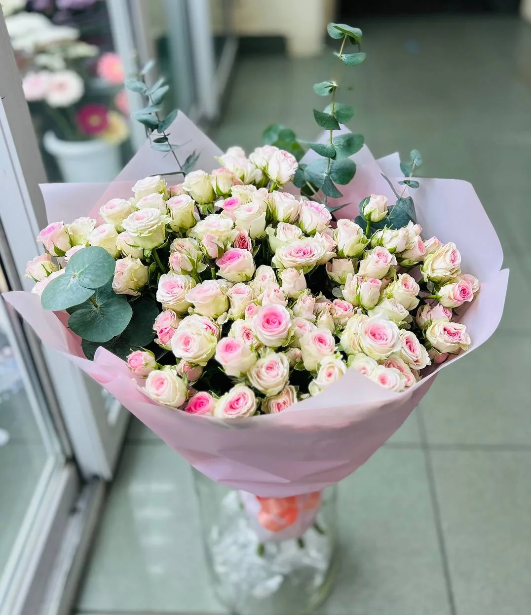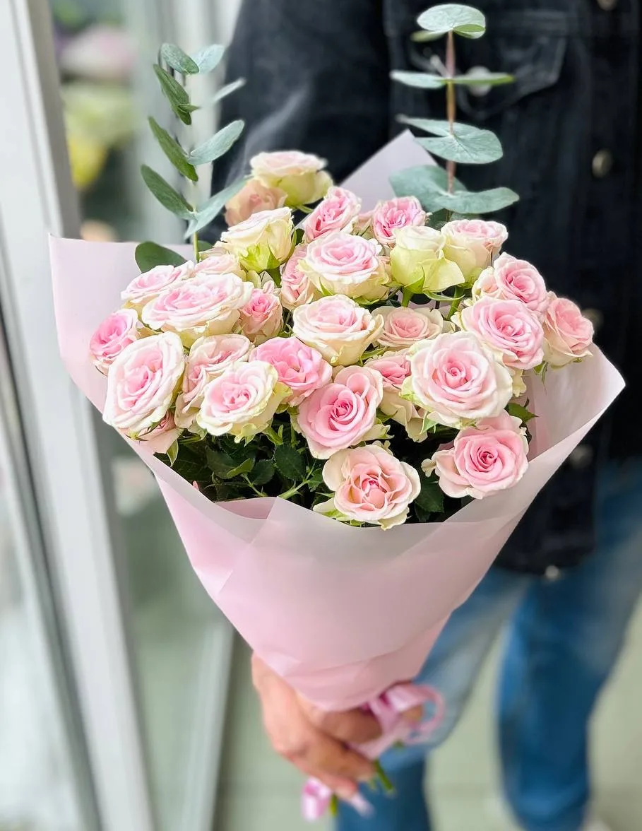 Кустовые розы, зелень, упаковка,лента |