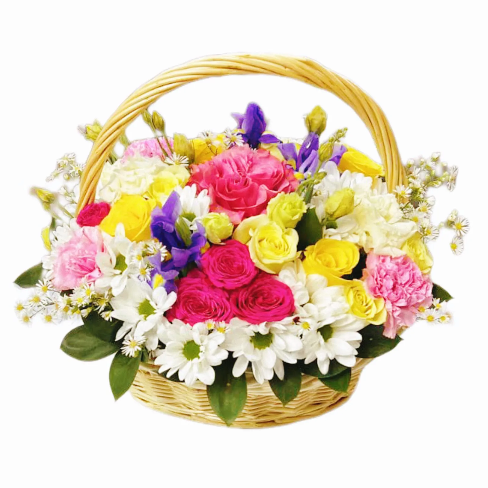 - Стандарт - роза - 7 шт., эустома - 3 шт., хризантема - 3 шт., ирис - 3 шт., гвоздика - 3 шт., салал, оазис, корзина