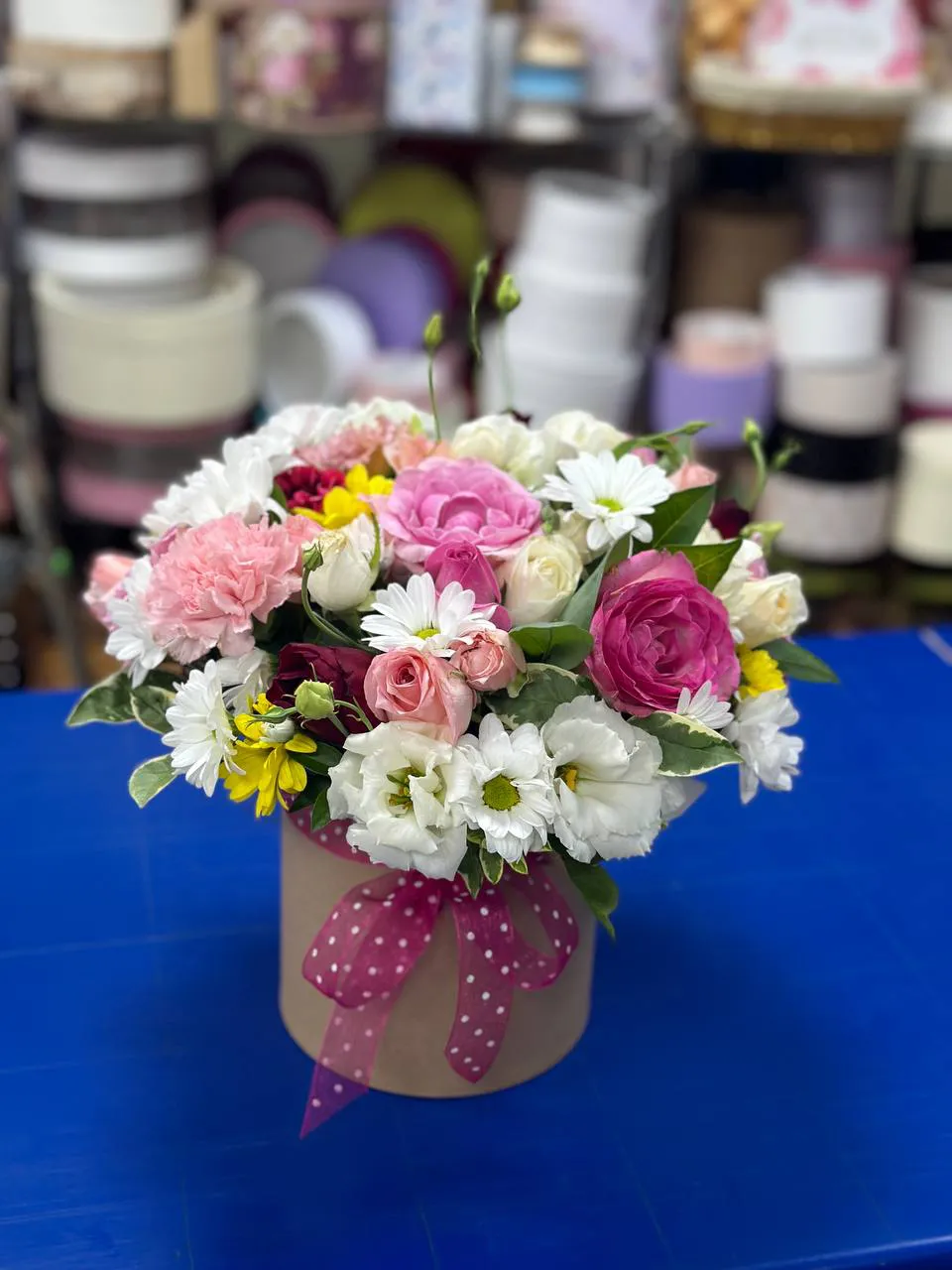 Шляпная коробка, выполненная в элегантном дизайне, обрамляет этот цветочный шедевр, придавая ему особенною воздушность и утончённость. Такой букет станет изысканным подарком для любого случая или просто приятным акцентом в вашем интерьере, наполняя пространство ароматом и красотой.