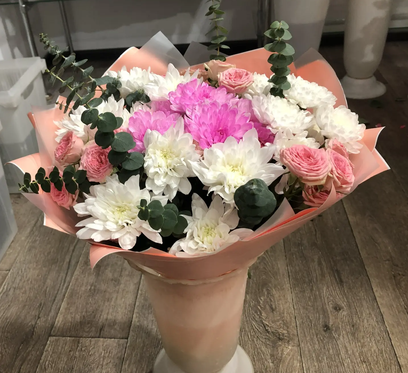 - Средний - кустовая роза - 3 шт., хризантема кустовая - 4 шт., упаковка, лента