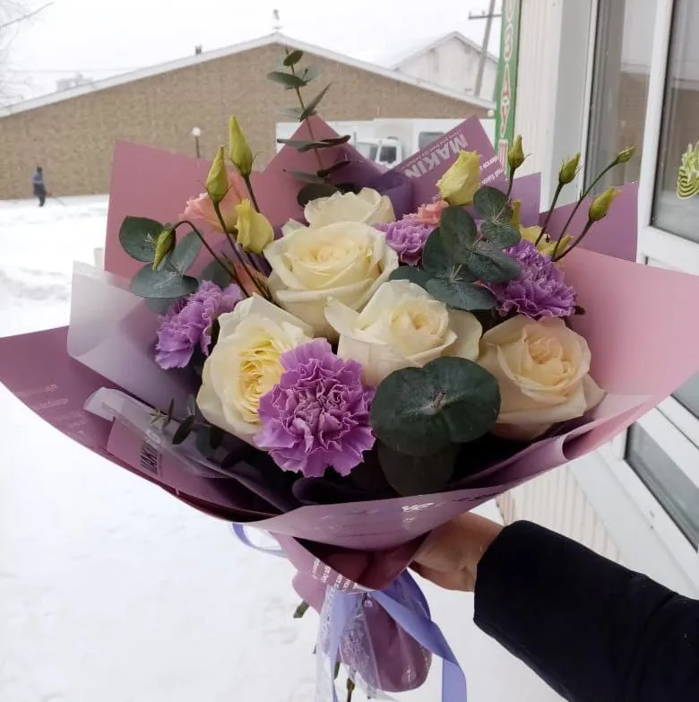 Розы, с их нежными лепестками и царственной аурой, символизируют любовь и страсть. Их пленительный аромат наполняет воздух теплом и чувственностью. Гвоздики добавляют букету текстуру и особую выразительность, их яркие окрасы и изысканная форма делают композицию более динамичной. А эустомы, с их нежными, почти загадочными цветами, привносят в букет нотки утонченности и романтики.