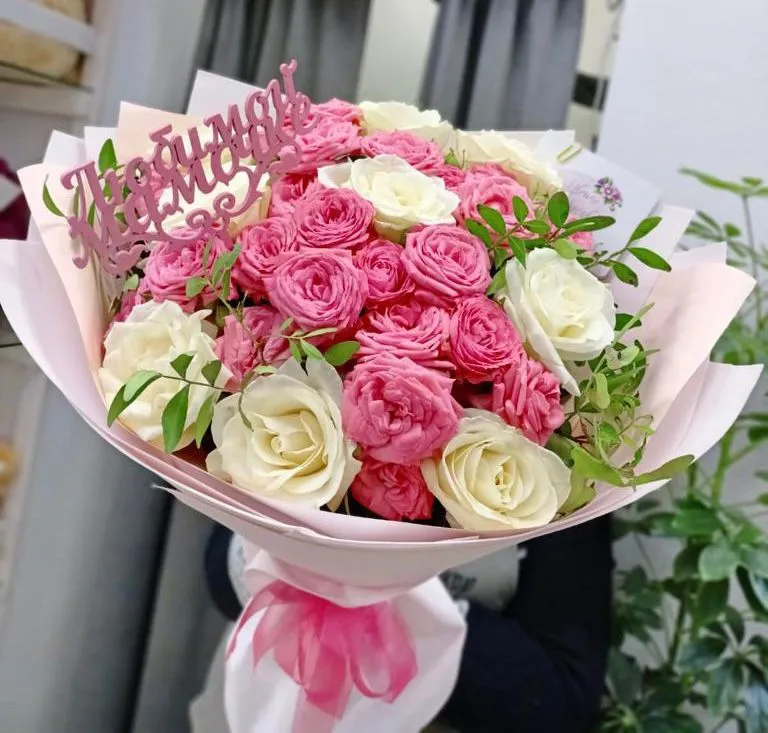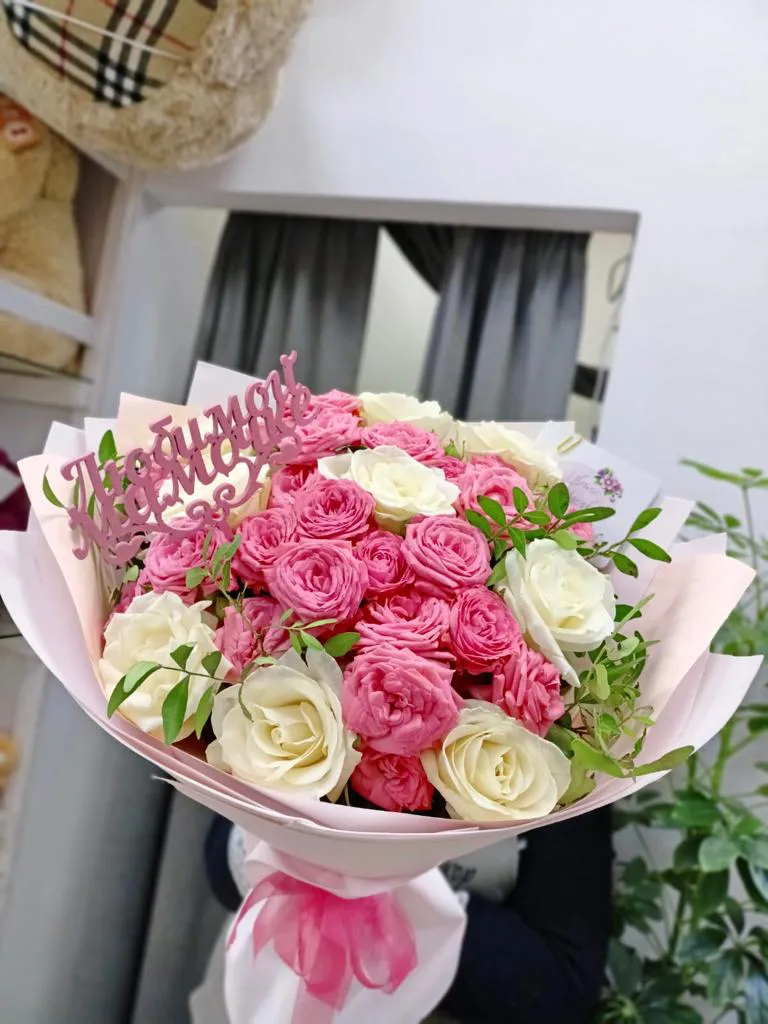 Состав букета: кустовые розы, одноголовые розы ,зелень, упаковка, топпер,лента |