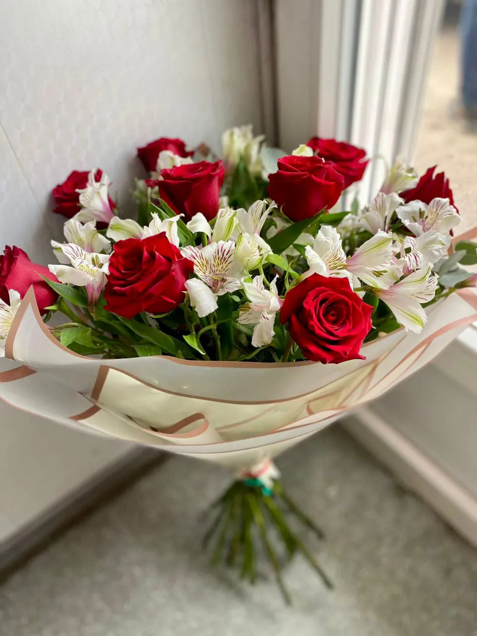 - Премиум - роза - 7 шт., альстромерия - 9 шт. зелень, упаковка, лента