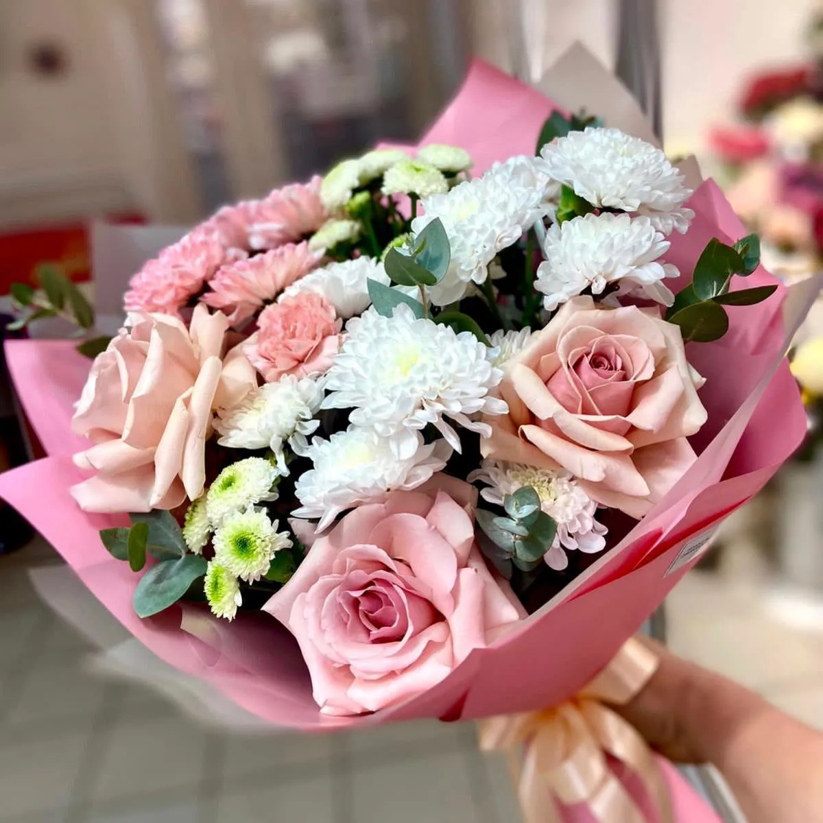 - Средний (роза - 5 шт., кустовая хризантема - 4 шт., зелень, упаковка, лента)