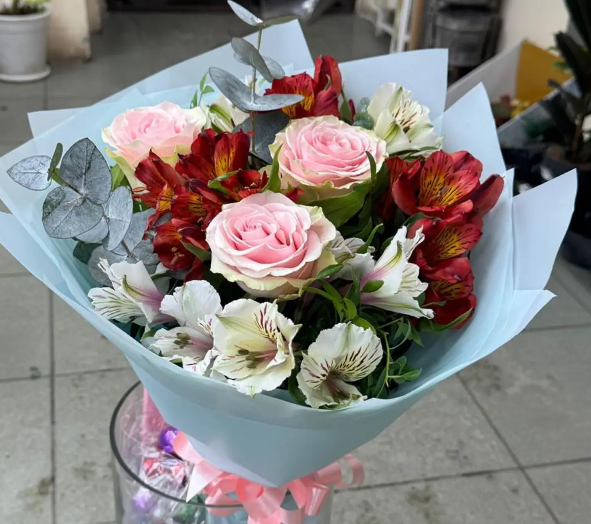Розы,альстромерии,зелень,упаковка,лента |