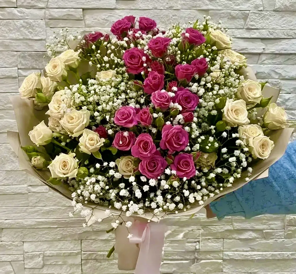 - Экстра - роза кустовая - 15 шт., гипсофила, упаковка, лента