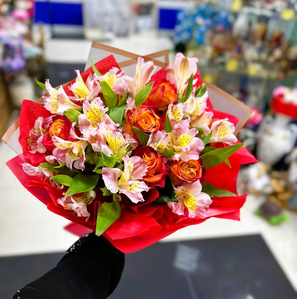 Такой букет станет прекрасным подарком для любой торжественной даты или просто для того, чтобы порадовать близкого человека. Яркие оранжевые розы гармонично дополняются нежными оттенками альстромерий, создавая настоящий шедевр флористического искусства.