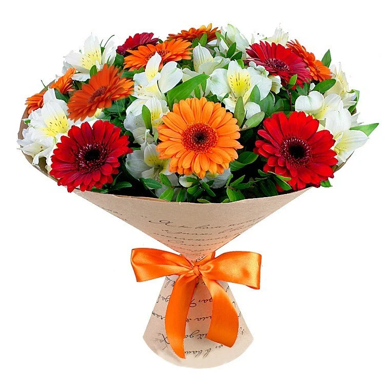 герберы, альстромерии, зелень, упаковка, лента |