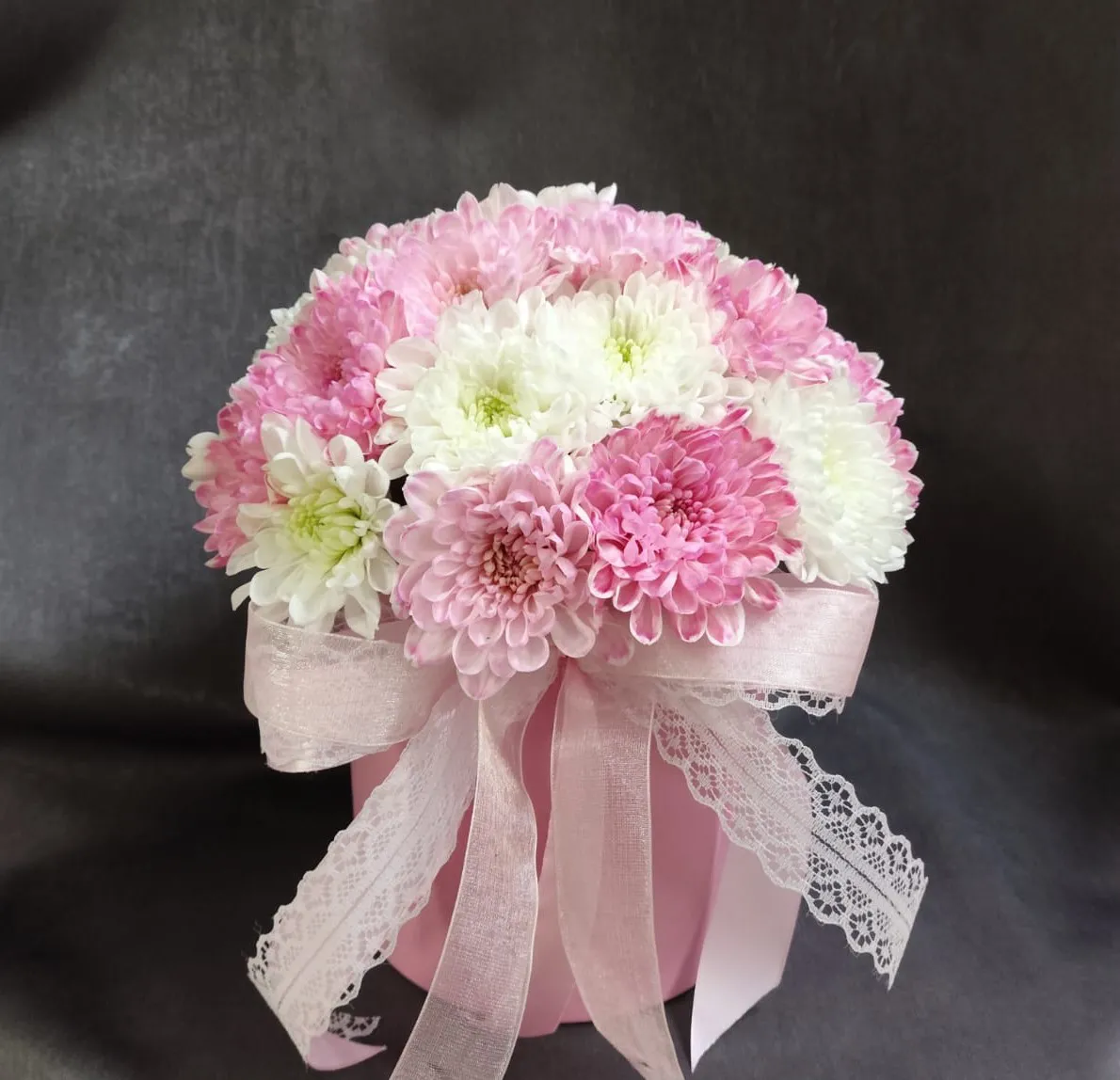 Пусть кустовая хризантема в шляпной коробке станет символом ваших самых искренних чувств и добрых пожеланий!