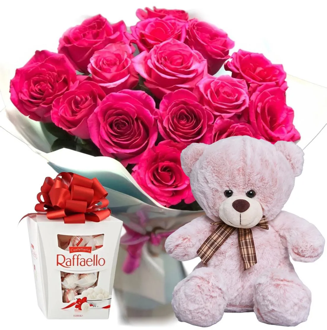 Розовые розы, игрушка и Рафаэлло — это не просто подарки, это символы заботы, любви и радости, которые вы готовы дарить своим близким. Подарите своим чувствам нежность и уют с этим идеальным набором!