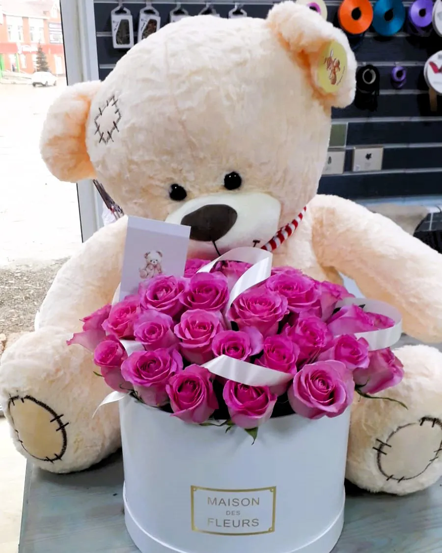 25 роз, шляпная коробка, оазис + мягкая игрушка 70 см |