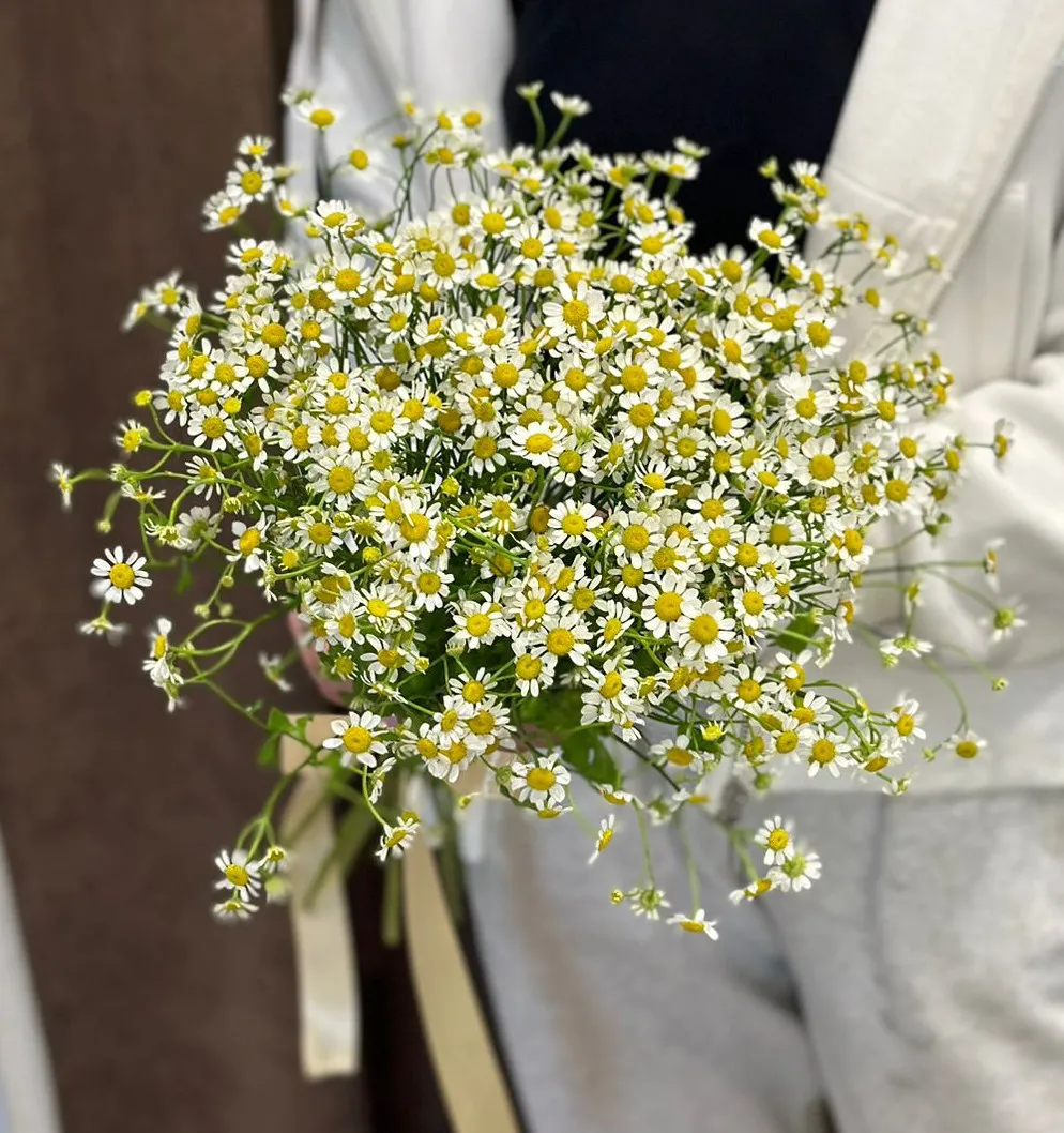 Ромашка олицетворяет невинность и чистоту, она часто становится символом искренних чувств и простых радостей жизни. Ее присутствие на букете придает ему особый шарм, словно добавляет ноту свежести и свежестью луга. Полевая ромашка — это напоминание о том, что красота может быть в самых простых вещах, и что счастье порой скрыто в мгновениях, полных света и тепла.
