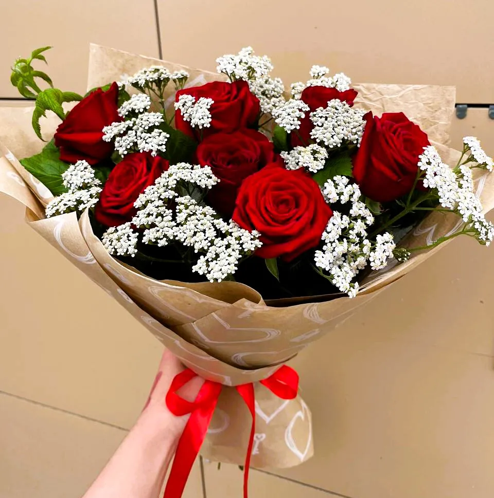 - Стандарт - роза - 9 шт, зелень, упаковка, лента