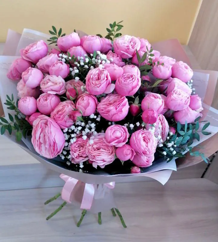 Пионовидная кустовая роза, гипсофила, упаковка, лента |