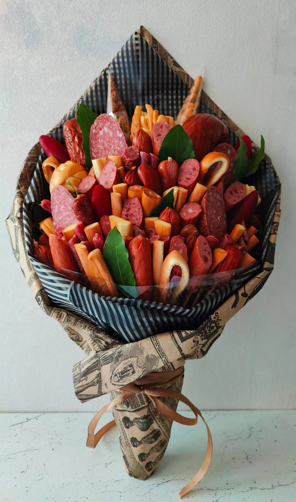 Букет из колбасок не только хорош для подачи на стол, но и станет ярким акцентом на любом празднике. Его можно использовать как закуску на вечеринки, корпоративы или семейные торжества. Такой оригинальный подход к традиционным закускам обязательно вызовет восторг и удивление у гостей, превращая обычное угощение в кулинарную арт-выставку, которая порадует не только глаз, но и вкус!