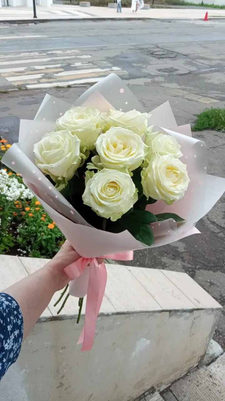 Белые розы 7 шт, упаковка, лента |