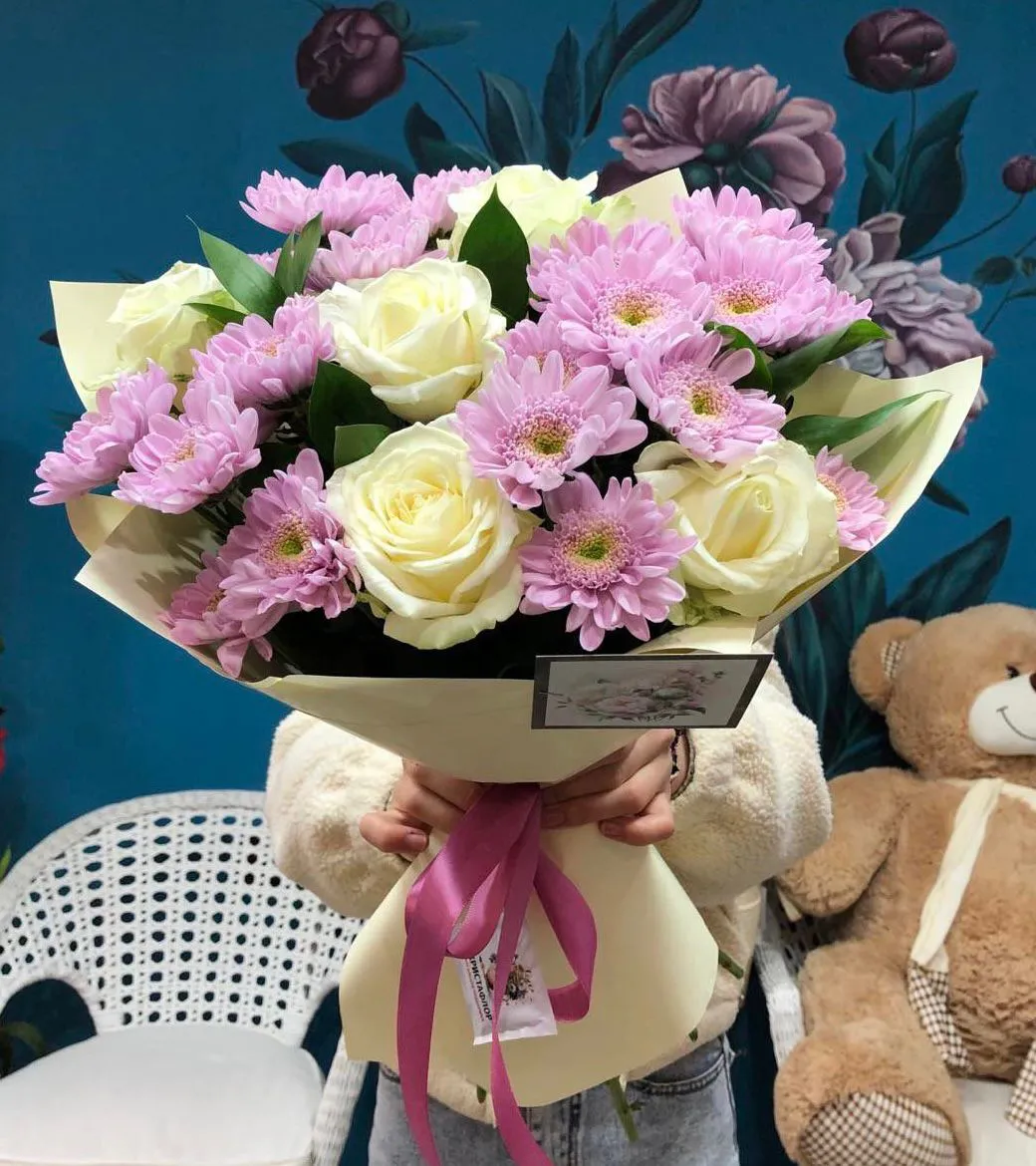- Стандарт (Кустовая хризантема 4 шт,, роза 5шт, зелень, упаковка, лента)