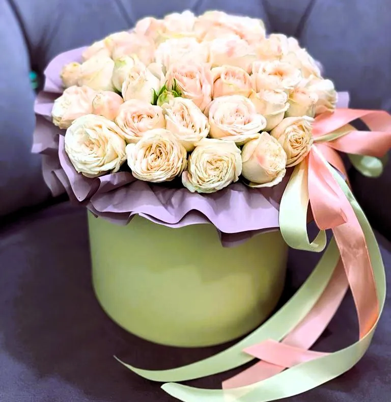 Каждая шляпная коробка отличается не только стильным дизайном, но и продуманной композицией. В ней аккуратно расположены кустовые розы, которые могут иметь разнообразную палитру – от нежно-розовых до ярко-красных оттенков. Такой букет станет прекрасным акцентом в любом празднике: дне рождения, юбилее или свадьбе.
