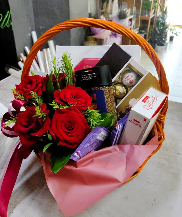 Сладкая корзина наполнена разнообразными деликатесами — от шоколадных трюфелей до фруктовых леденцов, что позволит каждому выбрать по вкусу. А аромат свежих роз добавит романтики и чары.