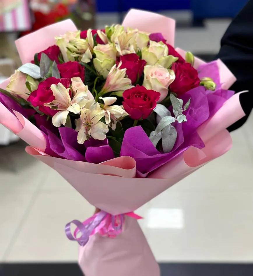 Каждый лепесток **розы** – это признание в самых искренних чувствах, а каждый цветок альстромерии – пожелание счастья и процветания. Вместе они создают гармоничный дуэт, который наполняет сердце теплом и радостью.