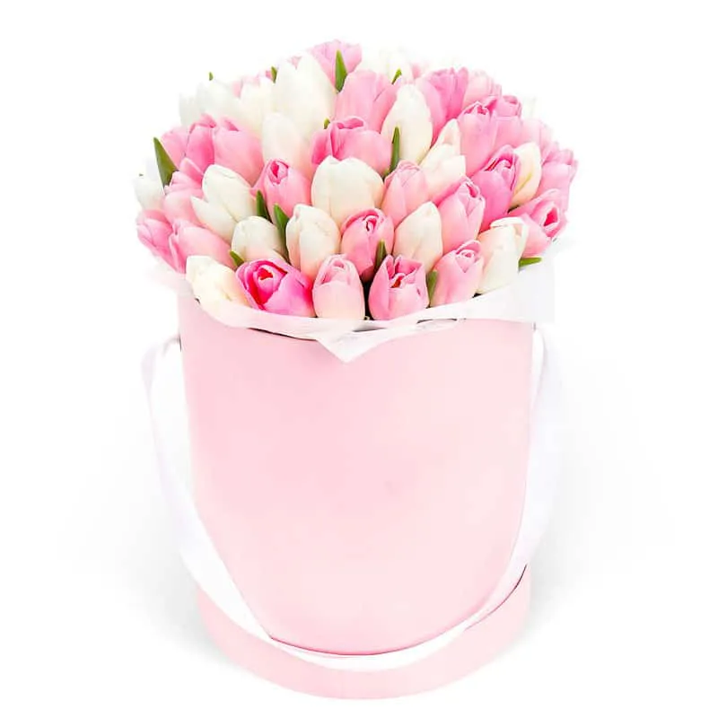 Тюльпаны, шляпная коробка, оазис, лента |