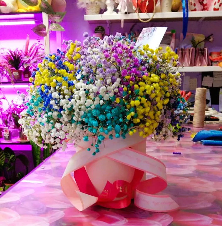На ее поверхности расцветают многочисленные соцветия гипсофилы, словно легкий облачный покров, переливающийся от белого до нежно-розового и голубого. Каждый цветок будто бы парит в воздухе, добавляя в композицию легкость и воздушность. Это настоящая симфония оттенков, где каждый нюанс подчеркивает красоту и хрупкость цветка.