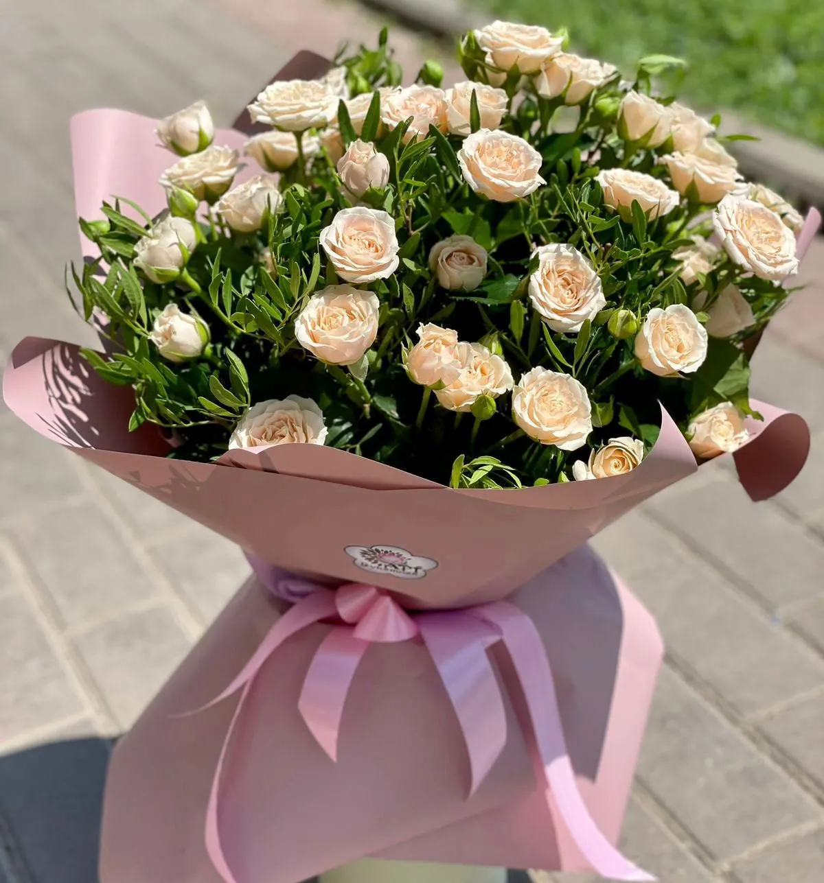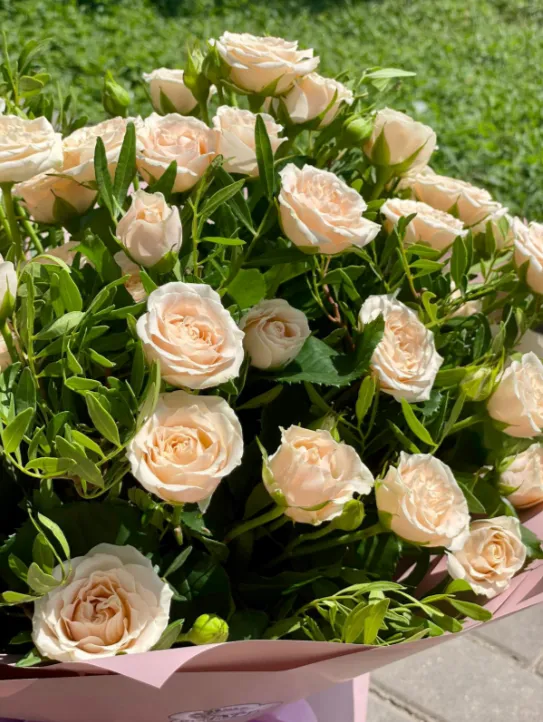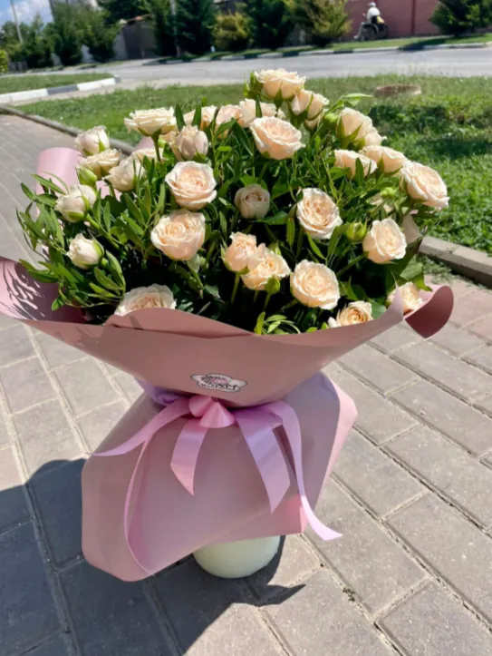 - Средний - кустовая роза - 7 шт., зелень, упаковка, лента