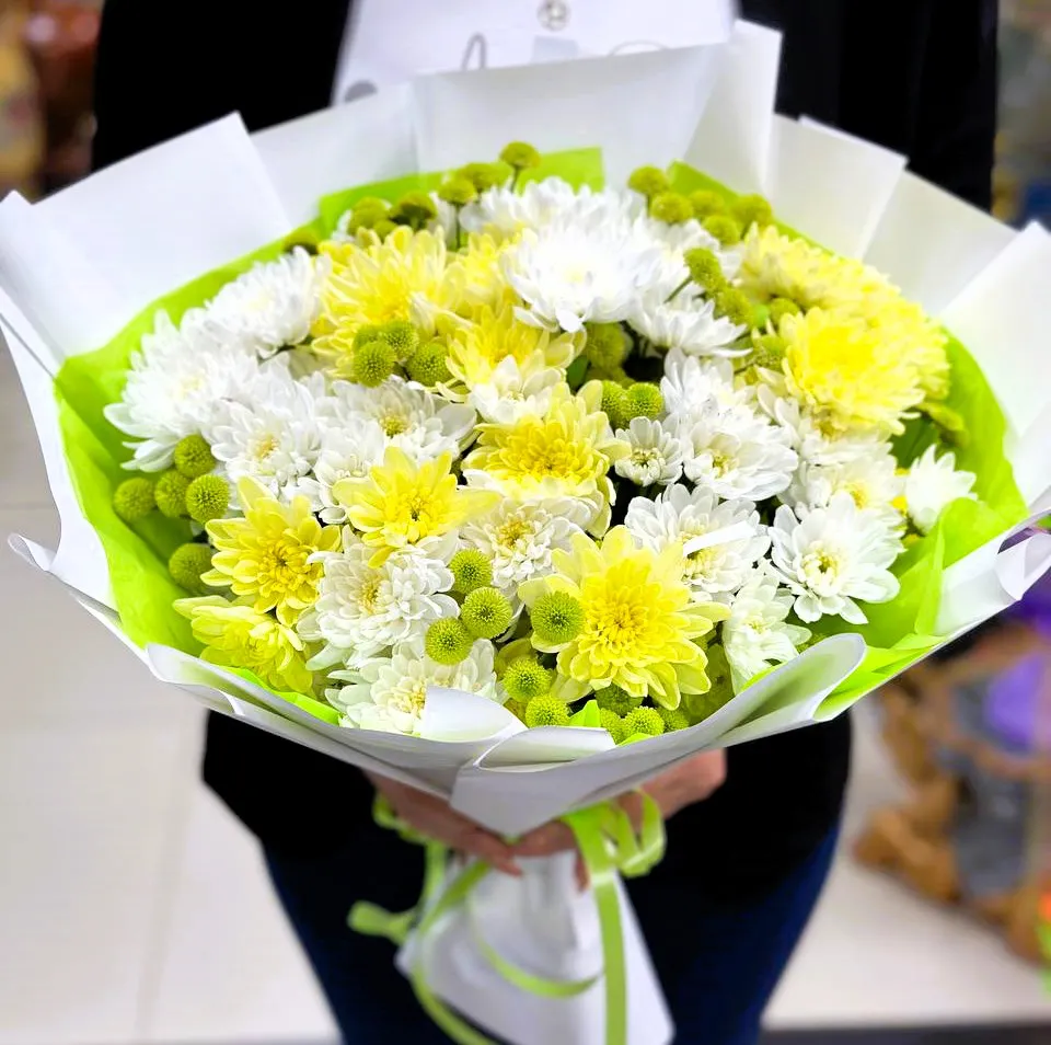 - Делюкс - кустовая хризантема - 15 шт., упаковка, лента