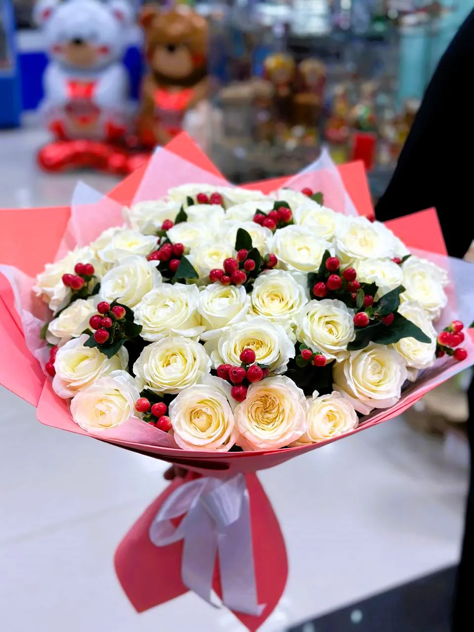 Гиперикум, известный также как зверобой, добавляет букету уникальности. Его красные ягоды и нежные цветы отлично контрастируют с белыми лепестками роз, создавая гармоничное и красивые зрелище. Этот букет станет не только прекрасным подарком, но и стильным украшением интерьера.